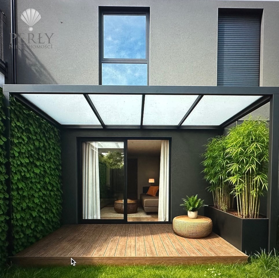 Dom z niedużym ogrodem, tarasem. W ostatnim zdjęciu, poglądowa wizualizacja tarasu, która może stanowić doskonałe dopełnienie nieruchomości.